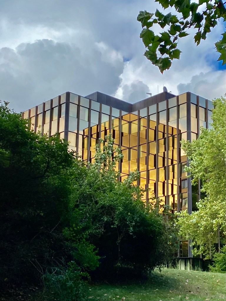 Ich wohnte ungefähr 600 Meter östlich von diesem Haus und konnte von meinem Bett aus direkt auf die dunkle Glasfront schauen. Wenn dann die Sonne aufging, spiegelte sich der rote Ball in den schwarzen Scheiben. Trotz Westfenster hatte ich meinen Sonnenaufgang!