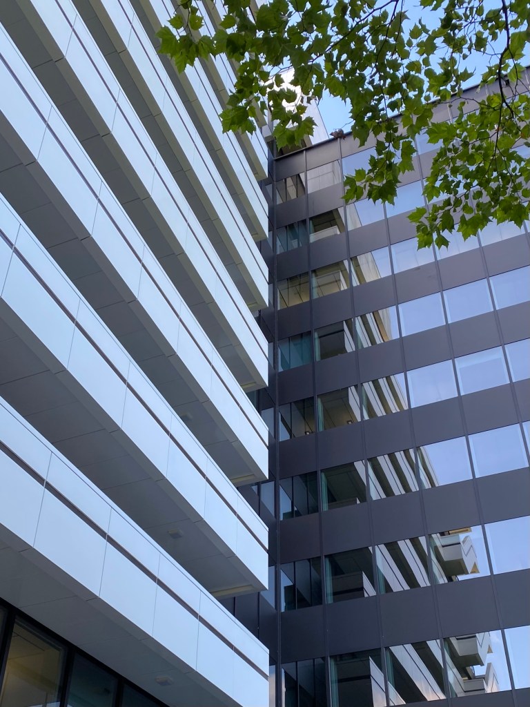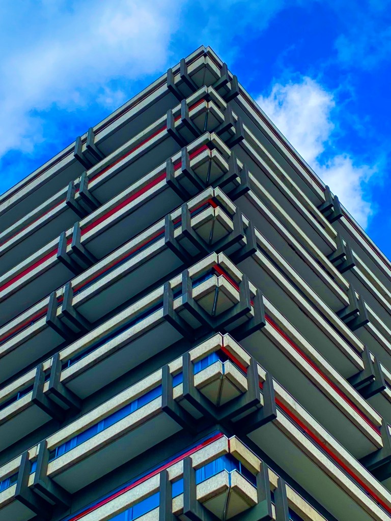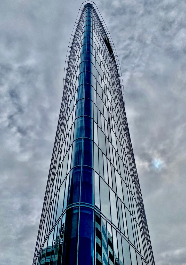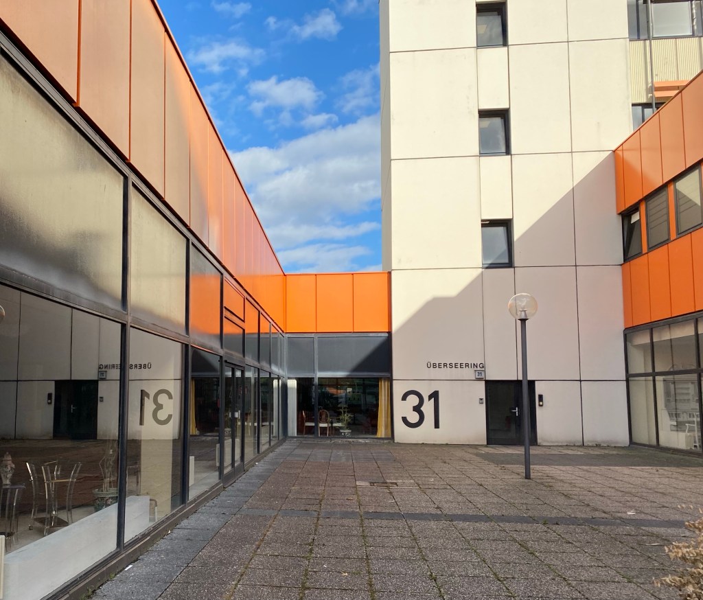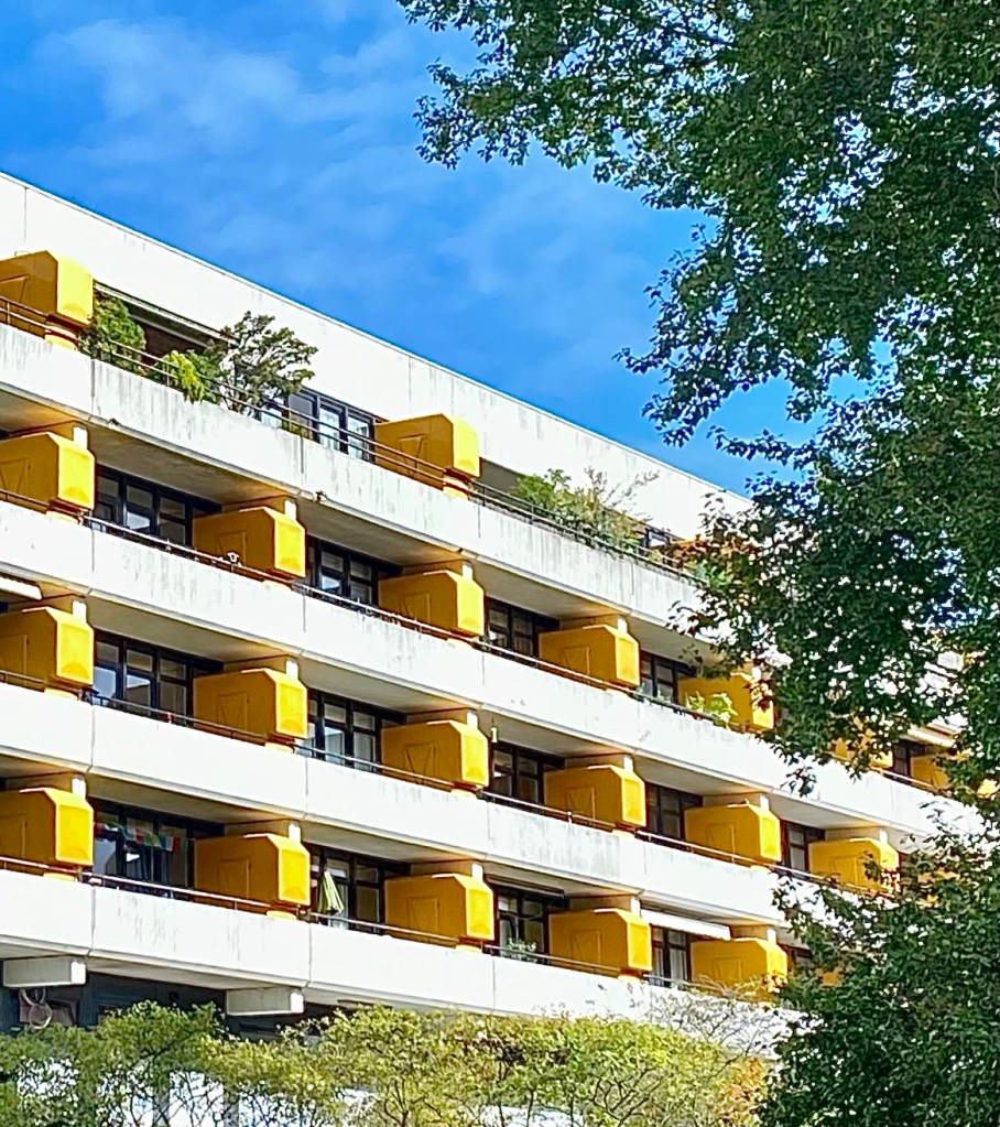 Ein Ausflug ging in die City Nord, zwischen Barmbek und Alsterdorf. Ich habe in den 70er Jahren, als diese City Nord noch neu und etwas Besonderes war, ihr gegenüber gewohnt und fand sie immer interessant aber auch etwas unheimlich. Denn am Wochenende und abends nach 17 Uhr war es dort gespenstisch still. Die Verwaltungs- und eben auch Representationsgebäude der großen Konzerne wurden nur noch von Hausmeistern bewacht, die Angestellten waren zu Hause, Wohnungen dort gab es nur sehr wenige. Interessant fand ich die kühne und kühle Architektur der späten 60er Jahre. So geht es mir noch heute mit den neuen Bauten, die entweder alte ersetzen oder neu hinzu gekommen sind. Glas hat allmählich Beton verdrängt. Mein Lieblingshaus allerdings, das Arne-Jacobsen-Haus von 1969, hatte schon damals Glasfronten – und das in Schwarz!