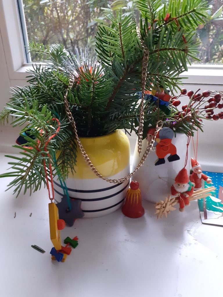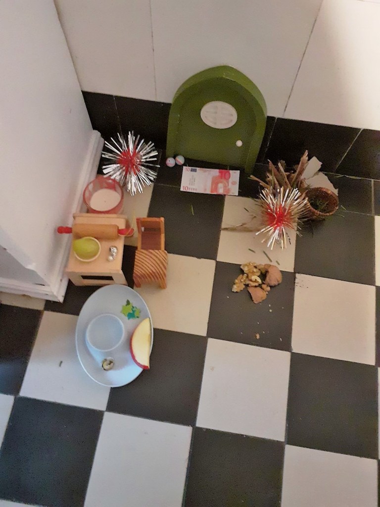 In diesem Jahr war ich dabei. Wir sitzen gemütlich am Esstisch, erzählen uns etwas. Mit einem Mal guckt Mama auf und fragt, wer wohl den kleinen schwarzen Beutel an den Türgriff gehängt hat. Keiner. Doch Janosch springt auf. Holt den Beutel. Schüttet ihn aus. Einige Walnüsse kullern auf den Tisch. Und ein Zettel liegt dabei. Wir müssen vorlesen. Und da steht´s: „hallo, Nisse ist wieder da“. Tatsächlich; an der Küchenwand steht wieder die Tür, die wir vom Vorjahr schon kennen. Gemütlich hat er sich´s gemacht. Ein Tisch, ein kleiner Stuhl, ein Korb mit Reisig stehen vor der Tür. Wir entdecken sofort, dass sind