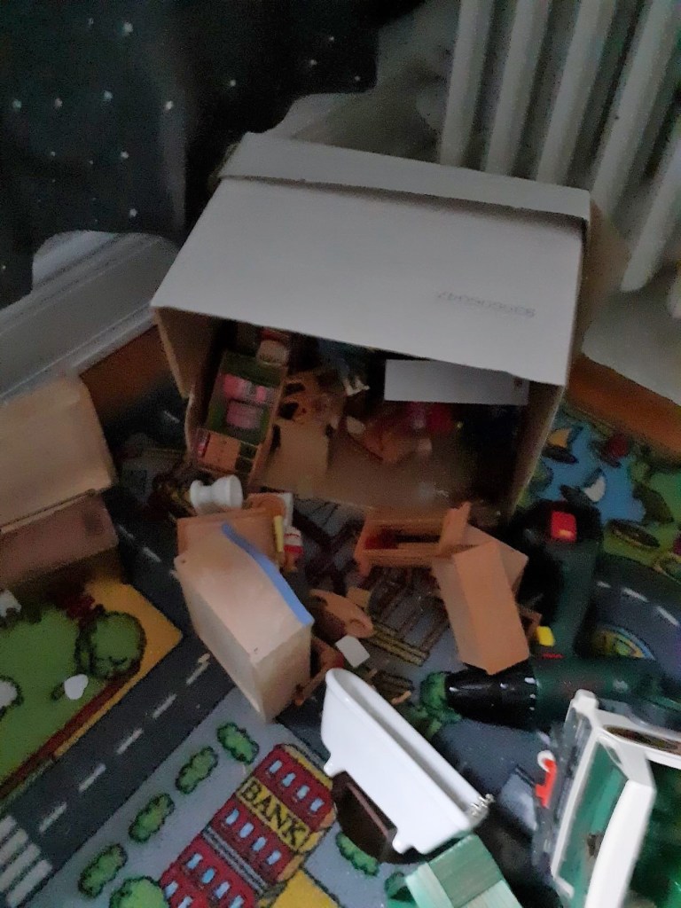 Puppenstubenmöbel auf der Kiste. Janosch rennt (er rennt, er rennt immer) ins Kinderzimmer. Kommt zurück. Nisse hat die Kiste umgekippt. Wir müssen nun alle mit gucken kommen. Das kann was werden. Er wird sich jede Nacht etwas ausdenken.