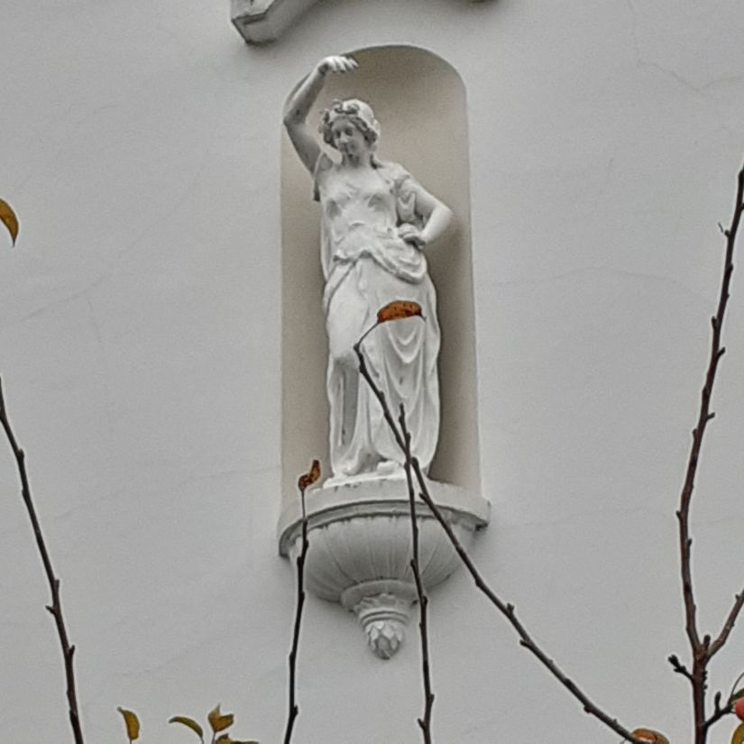Auch die Hausfassaden sind sehenswert mit Putten und Blumenranken. Bunt bemalt. Na, ein bisschen in die Jahre gekommen. Eine Dame aus Gips überblickt einen Hauseingang. Es wurde sich so viel Mühe gegeben, die Häuser zu schmücken. Dabei muss man schon den Kopf heben, um alles zu sehen. Ach ja.