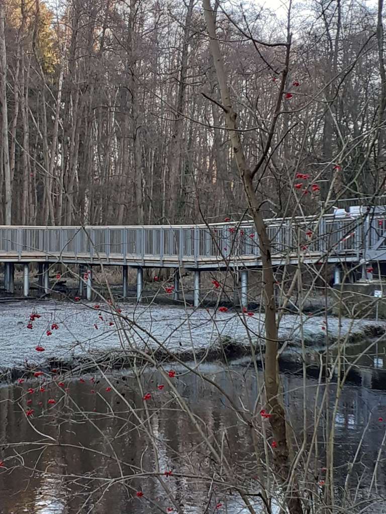 Erst einmal gehe ich nur ein Stück des Weges bis zur Brücke. Ziemlicher „Baggermatsch“ nach dem Schnee gestern. Da passiere ich doch lieber die Brücke, biege dann nach links in die Chrysanderstraße.