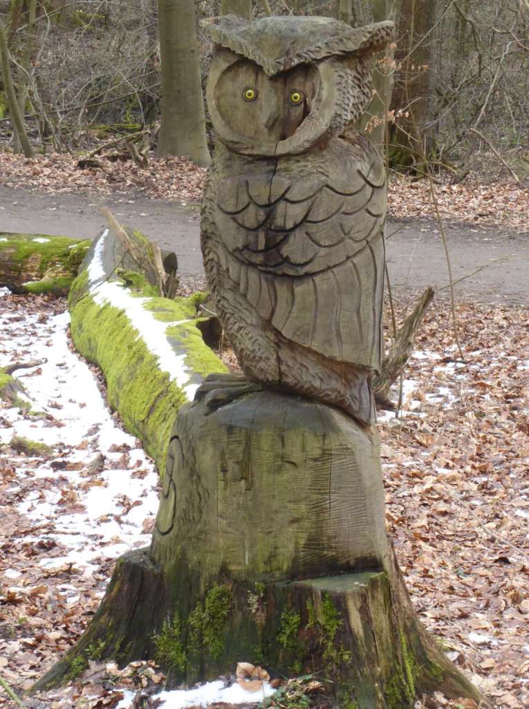 Bevor ich den Weg nach rechts nehme, entdecke ich eine Eule aus Holz. Ich habe mal nachgelesen. Sie wurde von einem Forstarbeiter in seiner Arbeitspause mal so eben mit einer Motorsäge aus einem Baumstumpf „geschnitzt“. Sehr schön.