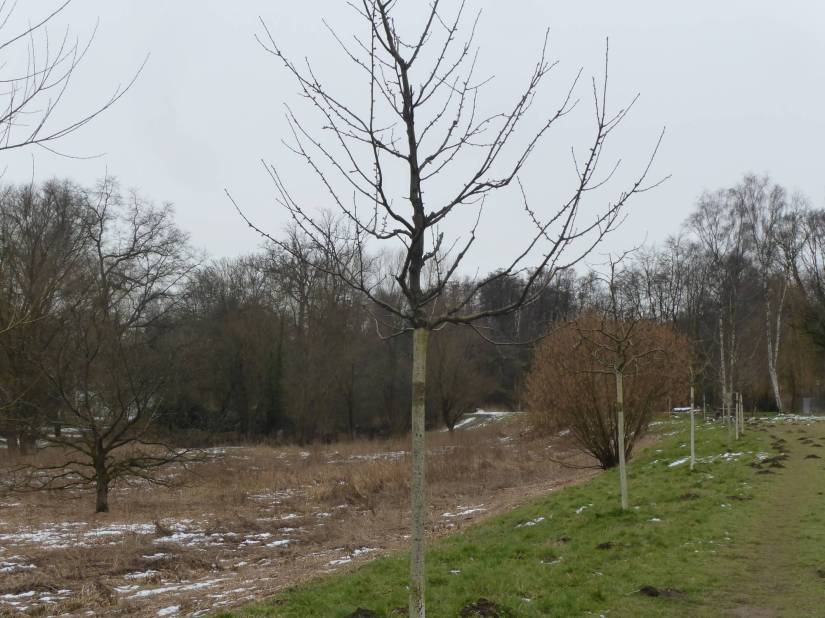 So und jetzt wieder nach links. Auf diesem 2000 qm großen Areal wurde eine Streuobstwiese angelegt. 24 Obstbäume stehen hier. Noch sind keine Pflanzen zu erkennen. Wahrscheinlich ahnen sie, dass doch noch Schnee und Frost kommt. Da bleiben sie noch ein wenig im Erdreich.