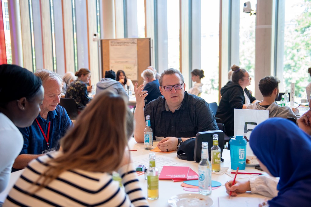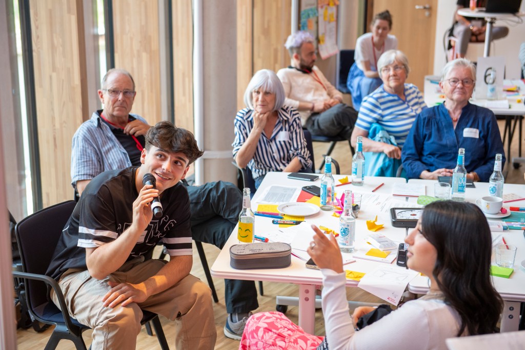 „Mehr Begegnungsräume für Jung & Alt“, hieß die Devise. Durch Impulse, Gespräche, Diskussionen und Workshops erarbeiteten die Teilnehmenden konkrete Pläne, wie das Zusammenleben in Bergedorf auf unterschiedlichen Ebenen verbessert werden kann. Per Los auf sechs Tische verteilt, wählten alle nach intensiven Diskussionen unter sechs Themen aus: Wo können Alt & Jung sich in Zukunft begegnen? Wie können wir verschiedene Kulturen zusammenbringen? Wie muss ein Begegnungsraum aussehen? Wie können Alt & Jung zum Thema „Soziale Medien“ voneinander lernen und sich gegenseitig helfen? Wo und wie können wir Kultur für alle kostenlos anbieten? Wie können wir Pflegekräfte entlasten und im Heim lebende Menschen besuchen?