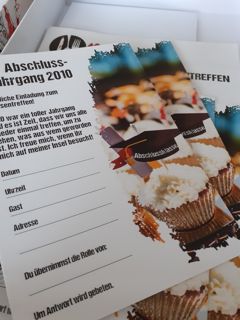 Nun den Karton öffnen. Den Partyplaner, in Form eines kleinen Heftes entnehmen und lesen. Die Anleitung für das Gelingen unseres Dinners, äh, Krimidinners. Es gibt Einladungskarten, auf denen die Rollen kurz beschrieben sind, und die nun verteilt werden müssen. Wir sind fair. Fertigen Lose an. Ein Kärtchen, ein Los (ohne hinzugucken). Schon ist eine Mitspielerin festgelegt. Es gibt Hinweise, wen man darstellen soll. Vorschläge für ein bisschen Verkleidung usw.