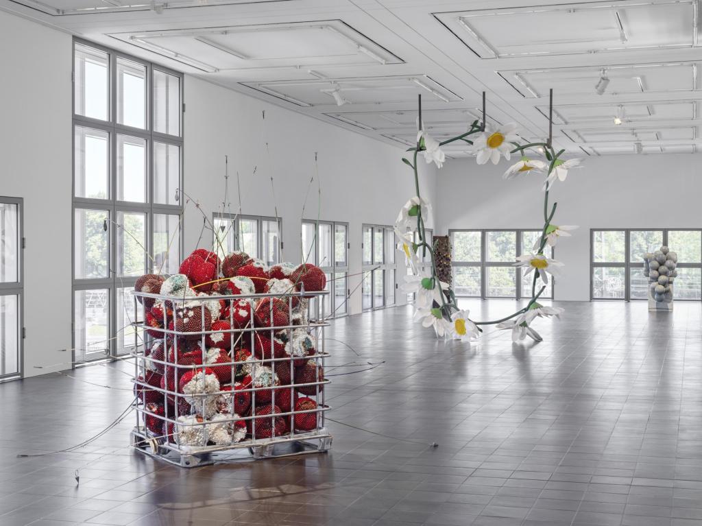 Alle ihre Skulpturen, große wie kleinere, bestehen aus gefundenen, gesammelten und wiederverwendeten Materialien. Ein großer Drahtkorb, gefüllt mit vergammelten Kirschen, deren Stengel ehemalige Antennen sind, die nach allen Seiten ragen, überreife Melonen, deren Schalen aus Kotflügeln bestehen, ein riesiger Blumenkranz aus Schläuchen und Plastikteilen.
