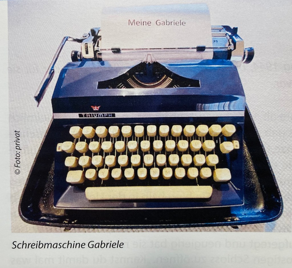 Seit 1975 hatte ich die Schreibmaschine nicht mehr benutzt. Der Firmeninhaber von Triumph hat sie nach dem Namen seiner Tochter Gabriele benannt. Meine Enkelin, 2005 bereits im Computerzeitalter geboren, hatte noch nie eine Schreibmaschine gesehen und kam aus dem Staunen nicht heraus. Ich selbst war erfreut, dass meine Gabriele noch funktionierte. Ich dachte daran, wie viele Seiten ich auf dieser kleinen Schreibmaschine in meinem Leben schon geschrieben hatte. Immer war sie verlässlich und überall einsetzbar ohne Strom, Akkus und Programme.