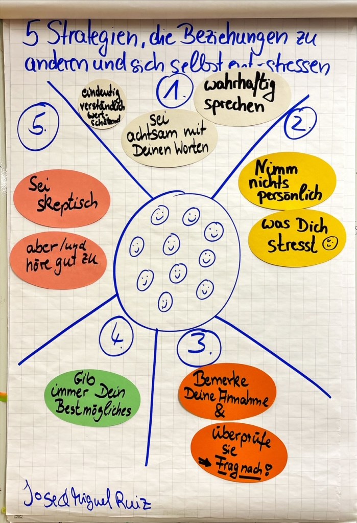 Nicht alles, was Imme Bruß bei diesem Treffen erläuterte, werden die Teilnehmenden bei ihrer Arbeit umsetzen können. Hilfreich aber waren auf jeden Fall fünf Strategien, die Beziehung zu anderen und zu sich selbst zu entstressen: 1. Sei achtsam mit Deinen Worten. 2. Nimm nichts persönlich. 3. Frage nach. 4. Gib immer Dein Bestmögliches. 5. Sei skeptisch, aber höre gut zu.