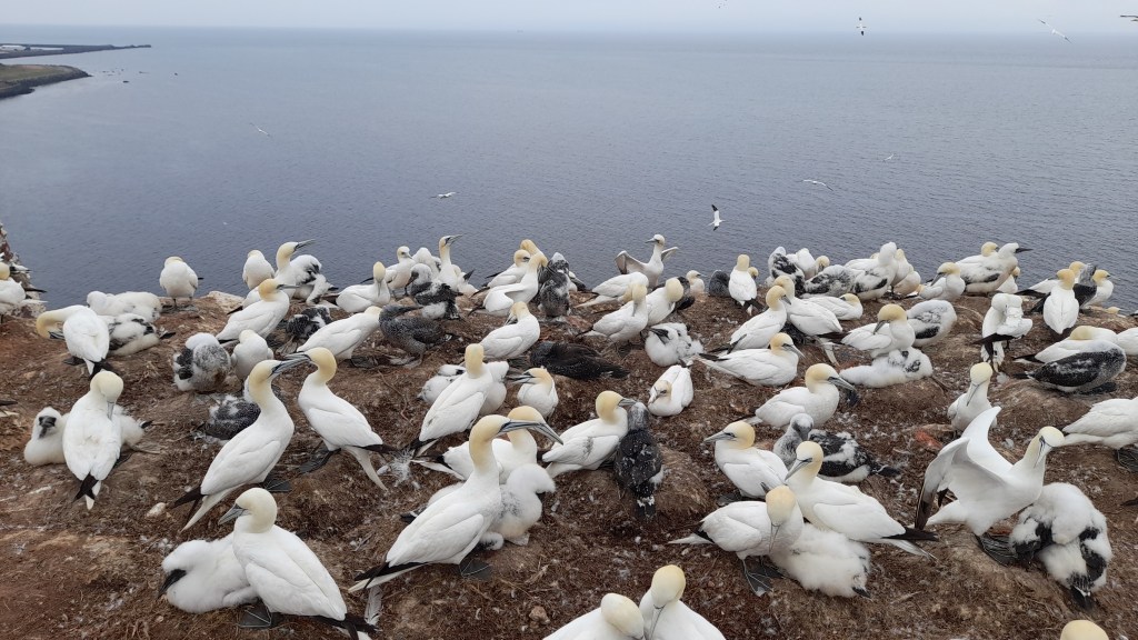 Ganz anders die Kolonien von laut schreienden Seevögeln – diverse Mövenarten, Basstölpel, Eiderenten und Austernfischer haben am Lummenfelsen ihre Brut- und Nistplätze. Unablässig flogen sie hin und her, aufs Meer hinaus und wieder zurück, schnatterten, kreischten, stritten und duckten sich dann wieder auf den steinigen Untergrund.