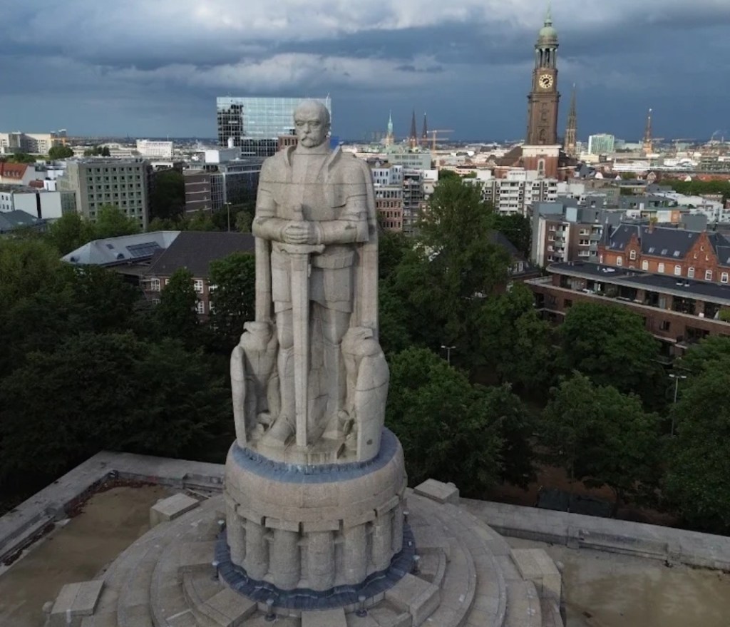 So stehe ich mit meinem Patenkind vor dem riesigen Bismarck-Denkmal, aufgrund seiner Größe von 34 Metern vom Hafen aus gut zu sehen. Allein der Sockel ist 15 Meter hoch. Natürlich will das Mädchen alles über diese Figur wissen. „Warum ist die so groß? Das muss ein wirklich berühmter Typ gewesen sein.“ Spätestens jetzt komme ich ins Schwitzen. „Er war Reichskanzler“, beginne ich meinen Vortrag. „Wie Merkel, Scholz und Merz“, ergänzt mein Patenkind. „Er hat die Kranken- und Rentenversicherung eingeführt“, kann ich noch problemlos nachsetzen. „Da hatten wir aber noch einen Kaiser.“ Ich komme dann aber nicht umhin, ihr von einem Politiker zu erzählen, der auch für Kolonialismus, Sklavenhandel, Ausbeutung und Krieg stand. Kann das weithin sichtbare Standbild auf diesem exponierten Platz verbleiben? Muss es nicht wie viele andere Denkmäler im Staub versinken?