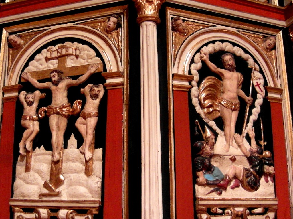 Das große Mittelbild wird durch zwei Säulen eingerahmt. Oben an ihrem Ende zeigen die Kapitelle ein Menschengesicht. Das eine hat die Augen offen, das andere geschlossen. Eine dezente Mahnung, hellwach zu sein und nicht zu meinen, dass der „Kirchenschlaf der gesündeste sei“. Professor Hans Eberhard Bock, Tübingen, hält den Kongreßschlaf für nicht weniger gesund.