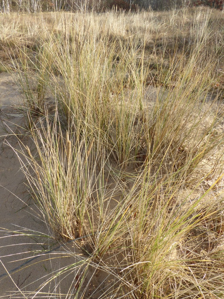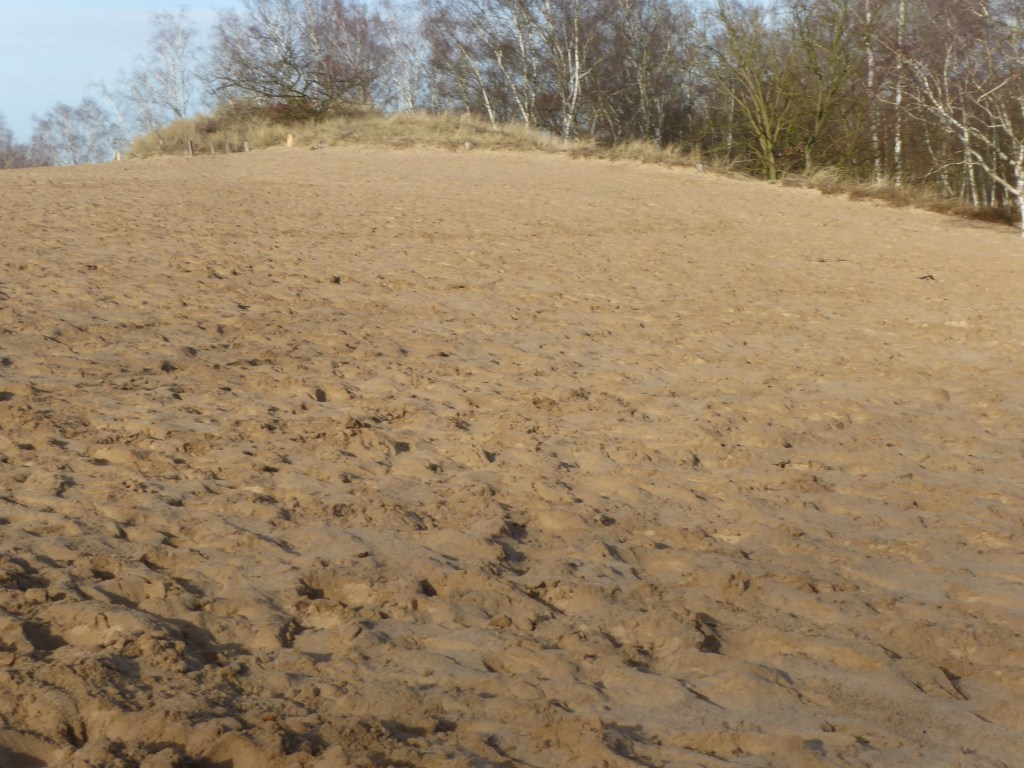 Und hier leuchtet durch das karge Wäldchen der Dünensand. Jetzt ist selbst der Sand mit leichtem Reif überzogen. Auch schön. Nur kalt. Im Sommer würde er unsere „Barfüße“ kitzeln. Na ja , alles zu seiner Zeit. Wir können zwischen vier Wanderwegen wählen. Schließlich ist dieses Gebiet ca. 350 ha groß. Da ist es gut, sich zu entscheiden. Erst einmal auf dem Dünenweg, der mit einem Schmetterling gekennzeichnet ist. Die Dünen sind teils mit hartem Strandhafer befestigt, damit Sturm und Wind den Sand nicht wegpusten. Brav bleiben wir auf den ausgewiesenen Pfaden. Leider halten sich nicht alle Erholungssuchenden daran. Schilder weisen darauf hin, aber…