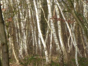 Wir überlegen nicht lange. Schließlich ist es Winter. Da bietet sich eine solche Wanderung an. Finden wir. Natürlich ist Matschwetter, und so nehmen wir nicht den Pfad oberhalb des Walter Hammer Weges; sondern gehen den breiten Weg an den Tennisplätzen vorbei. Links sehen wir Trockenrasen und graue Heidebüschel. Einige kleine Flecken sind eingezäunt. Bestimmt verstecken sich hier die auf der „Roten Liste“ stehenden Pflanzen. Schade, die Orchideen hätten wir gerne gesehen. Dafür strahlen Birkenstämme in herrlichem Weiß. Sind bestimmt die „Sibirischen“.