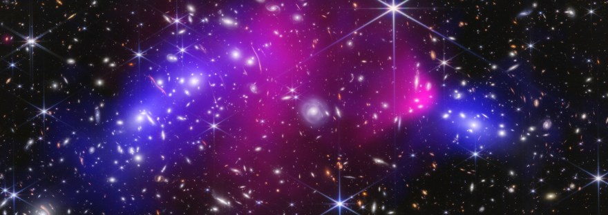 Glühende, heiße Röntgenstrahlen, die vom Chandra-Röntgenobservatorium der NASA aufgenommen wurden, erscheinen in Rosa. Das Blau steht für die Dunkle Materie, die von den Forschern mit Webbs detaillierter Bildgebung genau kartiert wurde.