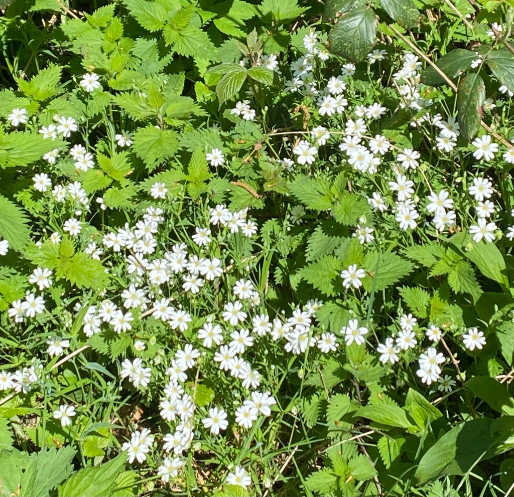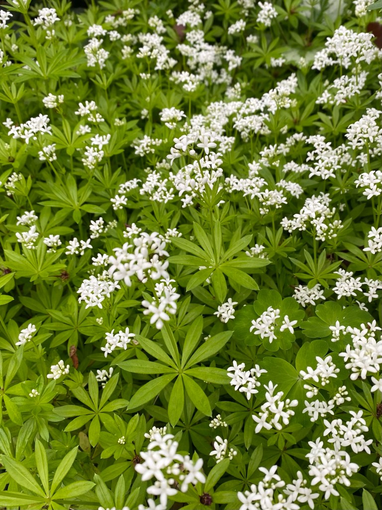 Für die Augen gibt es Grün, Grün ,Grün und nochmal Grün, alles noch ziemlich hell. Blüten von Wald-Sternmiere oder Waldmeister geben weiße Tupfer. Durch die Zweige schimmert der blaue Himmel.