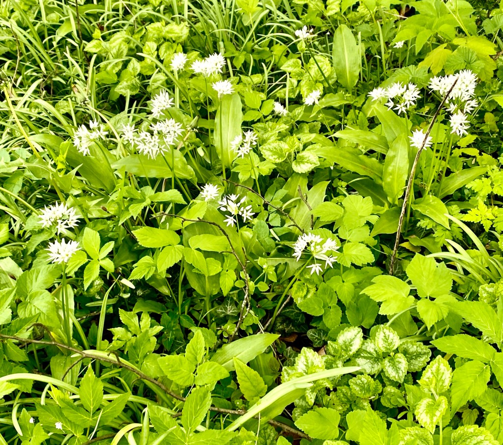 Es duftet waldig aber noch frisch. Vom Waldmeister pflücke ich mir ein Sträußchen für zu Hause. Das hänge ich dort an einem Faden auf, denn Waldmeister entfaltet seinen Duft nach zitroniger Bittermandel erst, wenn er trocknet. Da kommt mir ein Hauch von Knoblauch in die Nase, das muss Bärlauch sein! Den mag ich, drum pflücke ich ein paar Blätter und nehme sie in einer Tüte mit nach Hause. Dort wird es Joghurt-Soße damit geben. Über Pellkartoffeln, Nudeln oder Salat eine Köstlichkeit!