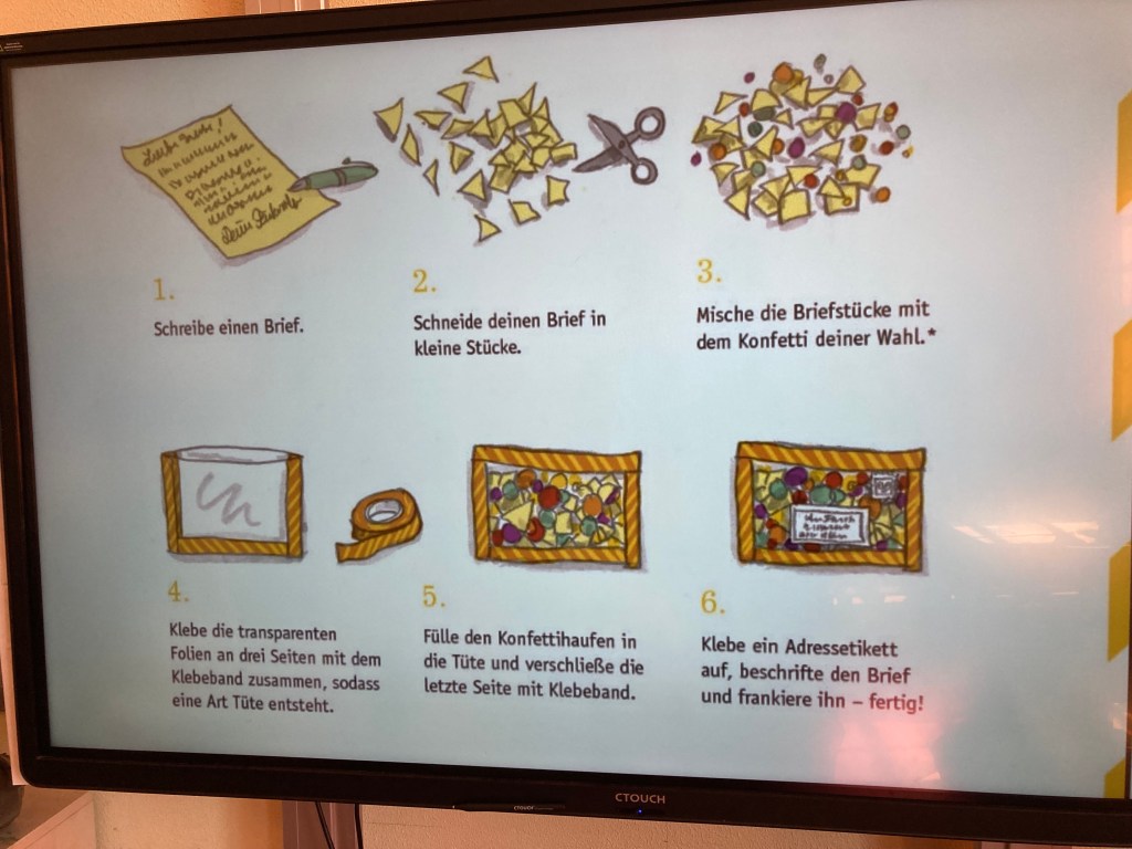 Zunächst geht es um das fast vergessene Briefeschreiben und verschiedene Briefformen. Nach einer kurzen Anleitung schreiben und basteln die Kinder eigene Briefe.