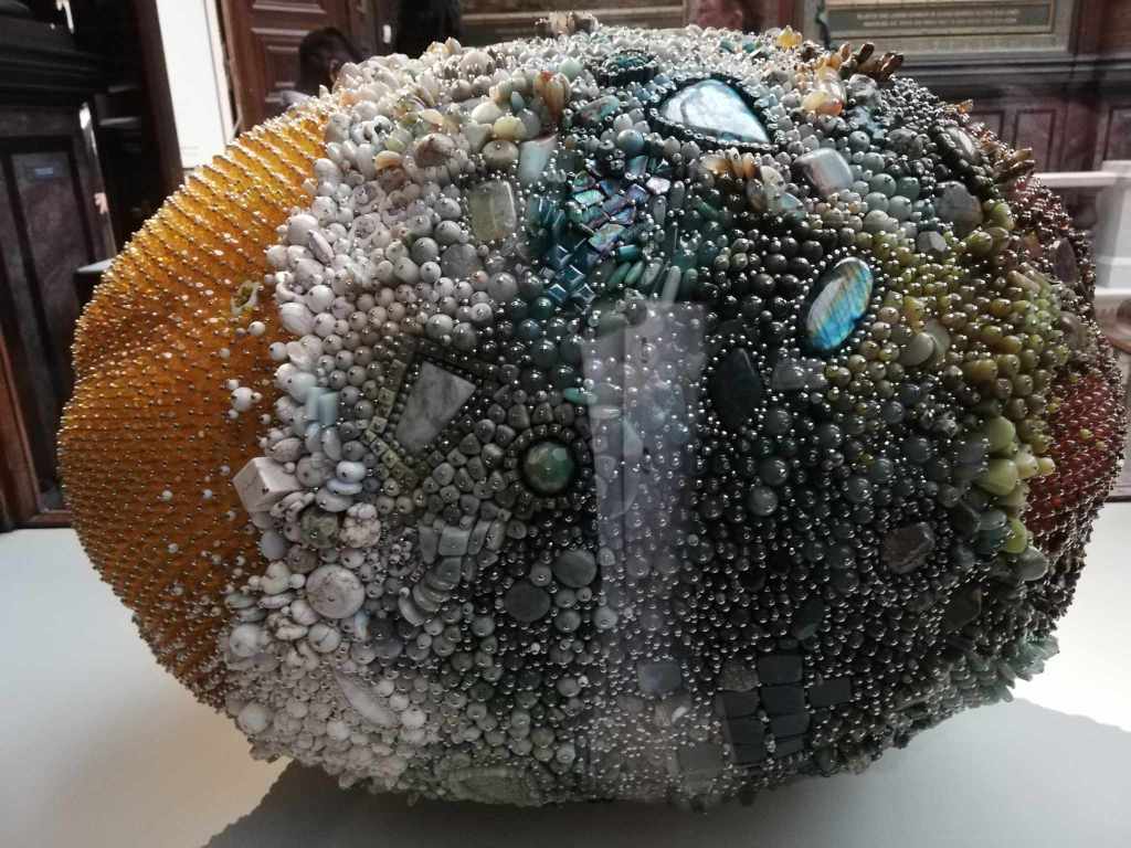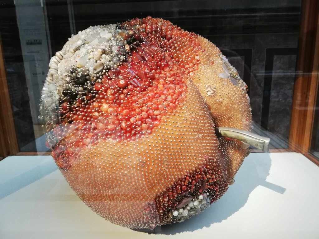 Umwerfend. Einzigartig. Wunderschön. Sprachlos stehe ich vor den rund 30 Arbeiten von Kathleen Ryan, die zur Zeit in der Hamburger Kunsthalle zu sehen sind. Besonders beeindrucken mich ihre übergroßen Früchte, Zitronen, Aprikosen, Kirschen, Melonen, voller Schimmel und Fäulnis. Und gerade diesen Prozess hat Kathleen Ryan durch Hunderte von farbigen Halbedelsteinen akribisch nachgebildet. Was ursprünglich abstoßend ist, erfährt auf diese Weise eine neue Schönheit, aus dem Glatten, Unberührten wird Bewegtes, Vielfarbiges.